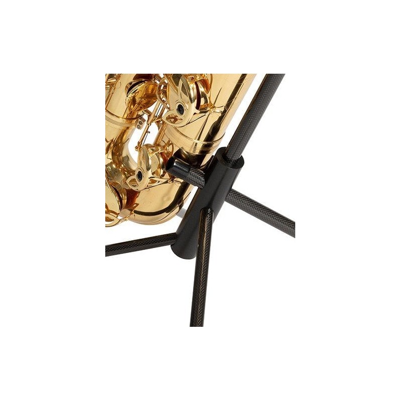El nuevo soporte de carbono de WoodWindDesign para saxofón barítono LOW A (PATENT PENDING) es extremadamente estable gracias a la gran superficie de apoyo de las cuatro patas con pies de goma, el diseño amortiguador y el soporte de campana especialmente diseñado. Este soporte de campana se adapta perfectamente a las curvas de la propia campana, por lo que tiene una gran superficie de contacto con la campana. Debido a que esta zona de contacto está revestida de caucho real (no de gomaespuma) el agarre del instrumento es perfecto, así como la protección de su instrumento. Si tuviera que cambiar de instrumento muy rápidamente y colocara el instrumento en el soporte en una posición incómoda, el instrumento permanecerá en esa posición y no se deslizará más ni se inclinará. Los dos soportes inferiores del instrumento son las terminaciones de las patas traseras. Estos puntos de contacto están revestidos de goma para mayor agarre y protección.
